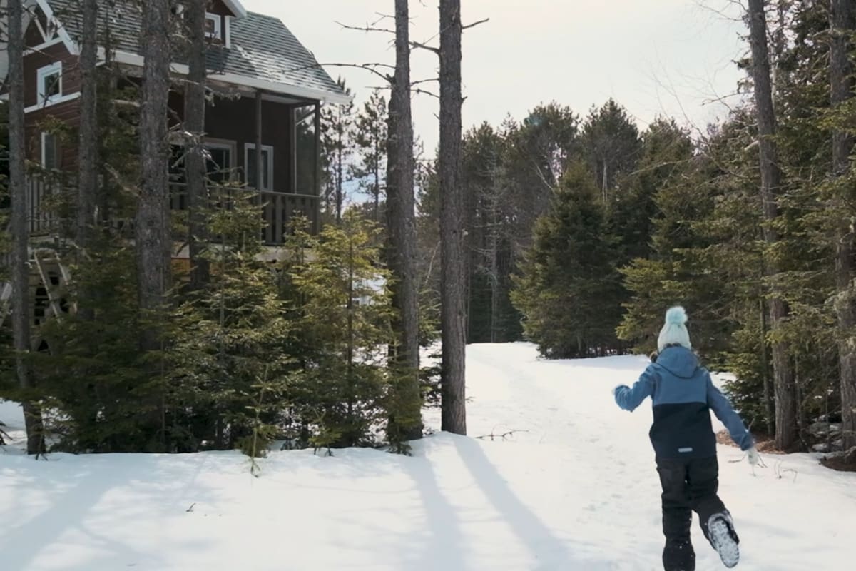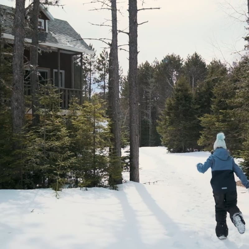 Enfant qui cours vers un chalet l'hiver.